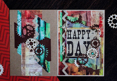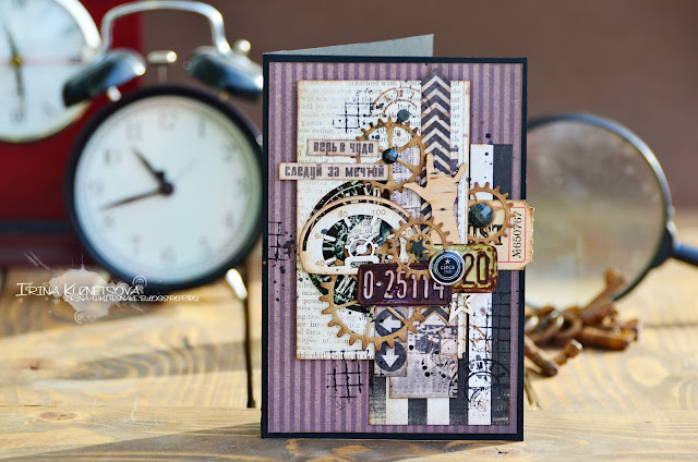 Я приготовила открытку на 23 февраля для мужа, пусть этот праздник будет для него очередным Happy Day) В работе использовала бумагу 7 Dots Studio (коллекция "Dreamer"), вырубку и чипборд шестеренки, брадс; основа - крафт.