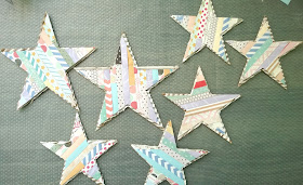 Прикладываем к оборотной стороне листа наши звезды-заготовки и вырезаем ЧУТЬ МЕНЬШИЕ звезды из бумаги: